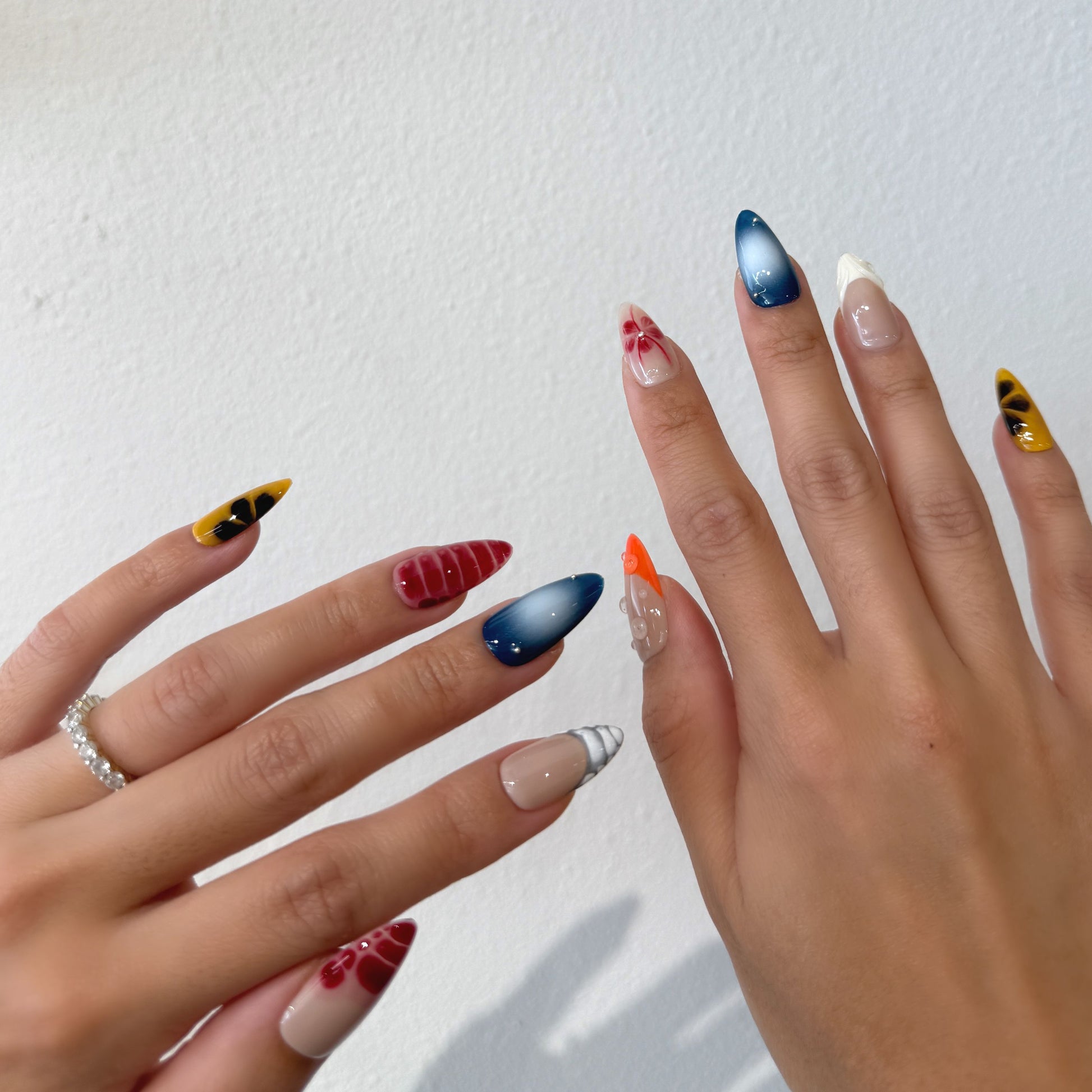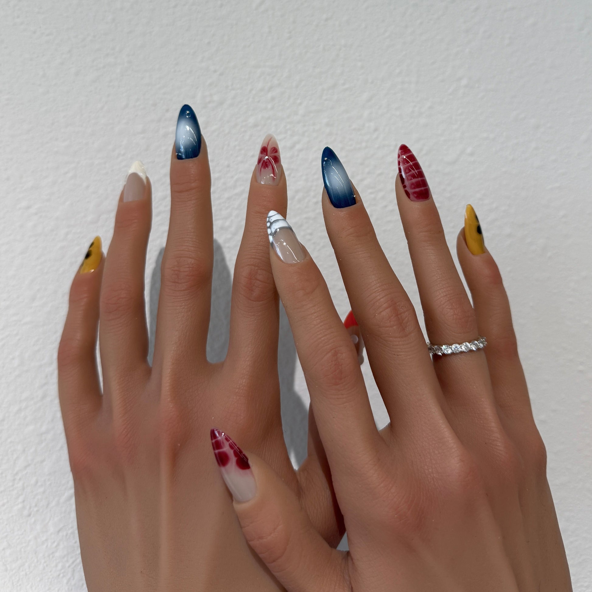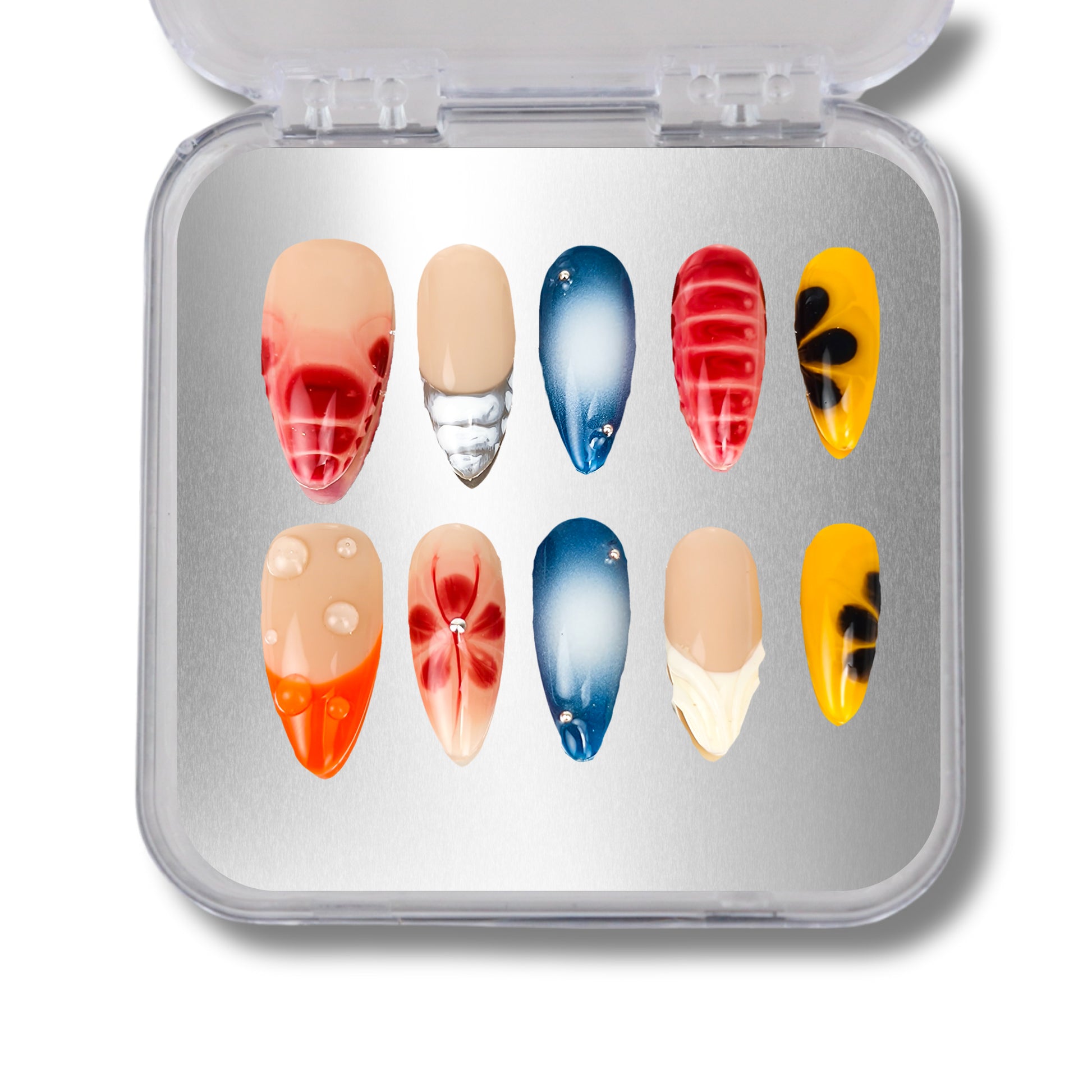 Carnival Dreams is a playful mix of vibrant press-on nails featuring bold reds, sunny yellows, ocean blues, and 3D accents. Perfect for anyone who loves fun, artistic nails that make a statement at festivals, vacations, or parties.