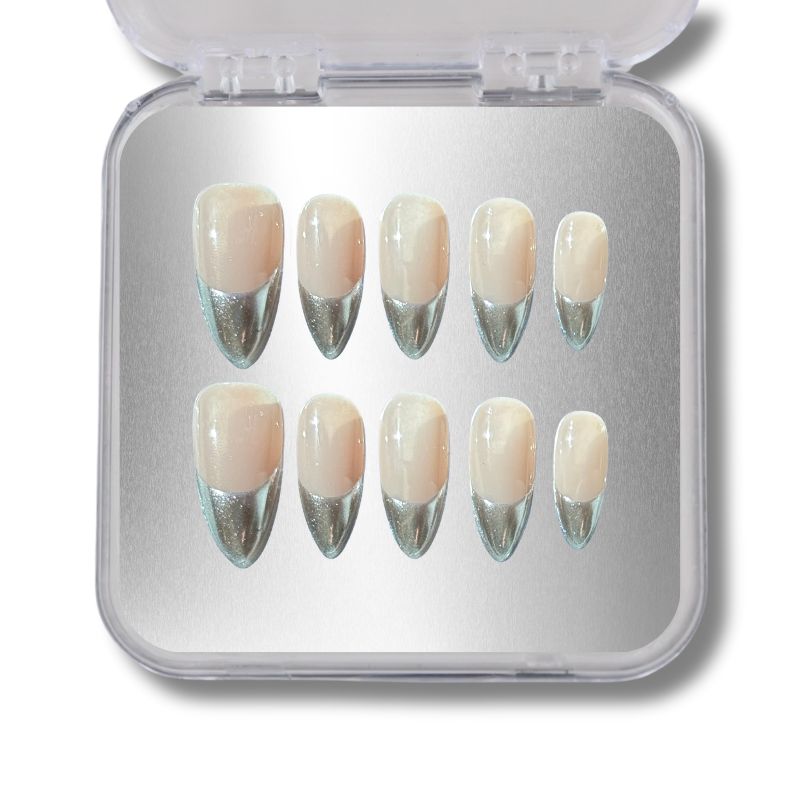 Chrome Drip is a bold twist on the classic French manicure, featuring a glossy nude base and sharp silver chrome tips. Sleek, edgy, and eye-catching—perfect for night outs, parties, or futuristic glam moments.
