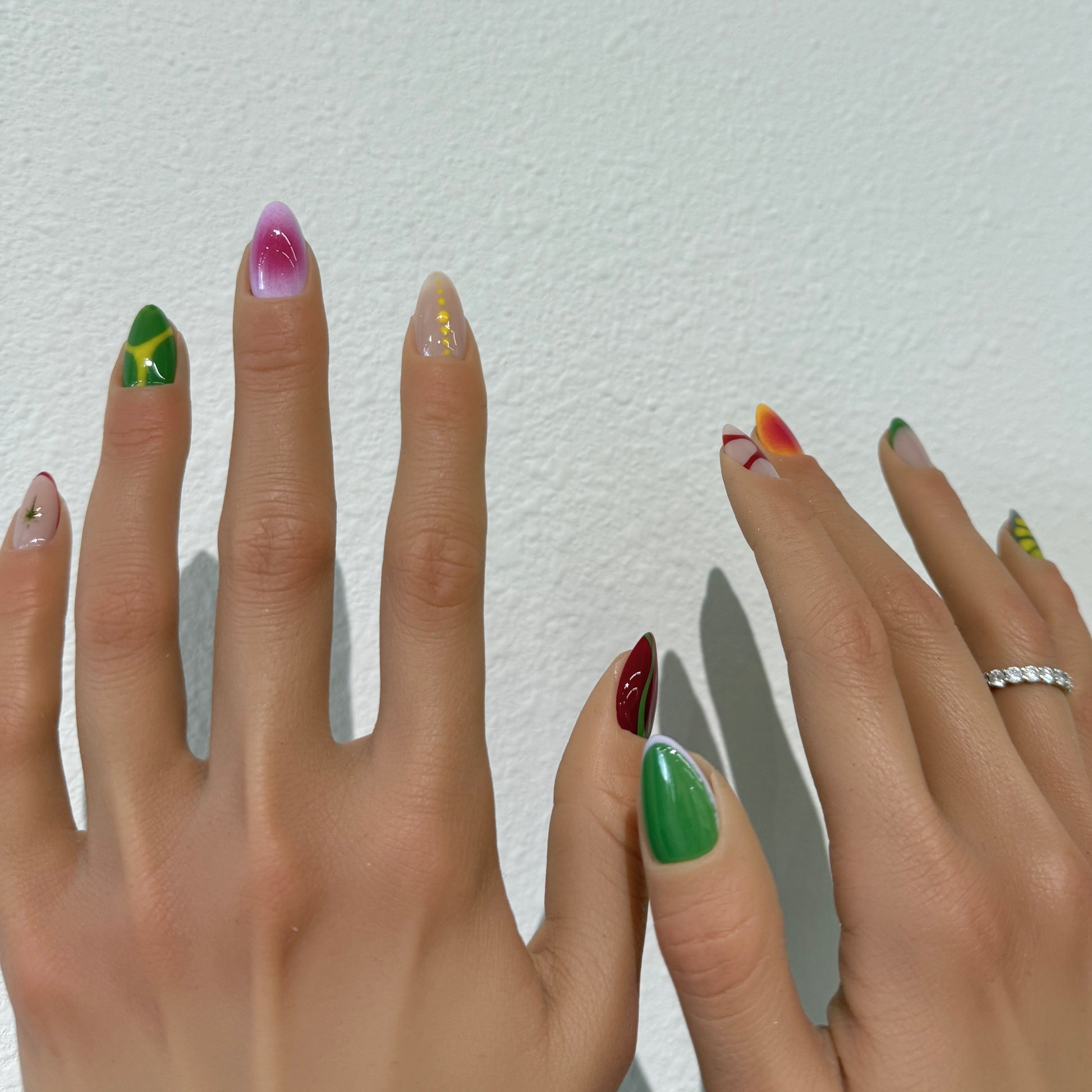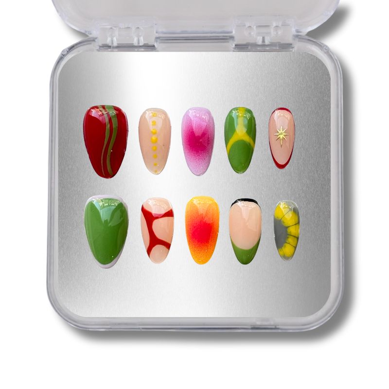 Finess is a vibrant press-on nail set featuring bold greens, reds, yellows, and pinks with playful abstract accents. Perfect for summer vibes, festivals, and anyone who loves fun, statement-making nail art.