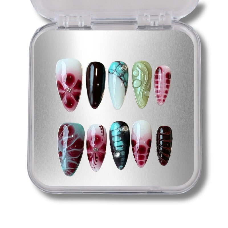 A dark mix of burgundy, teal, and sage with moody marbling, 3D textures, and sharp rhinestone flashes. A bold, rebellious set for nails that refuse to play nice.