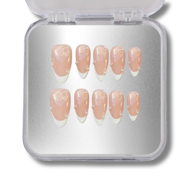 French Kissed is a timeless nude press-on nail set with crisp white French tips and dainty gem accents. Classic, polished, and versatile—perfect for everyday elegance or special occasions.