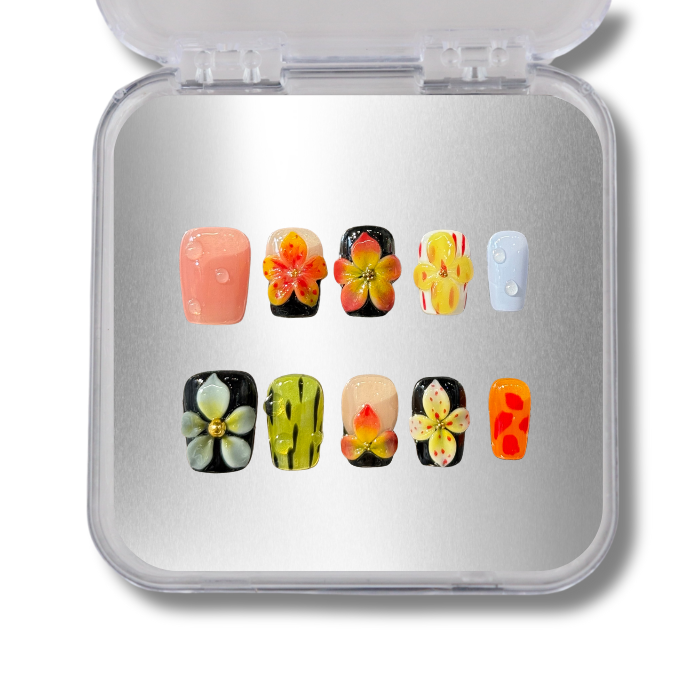 Add a burst of color to your look with our Fruit Punch press-on nails. Featuring bold floral accents, juicy fruit-inspired patterns, and vibrant tones, this set is perfect for summer vibes, festivals, or anyone who loves a playful pop of art on their fingertips. Easy to apply, reusable, and full of tropical energy!