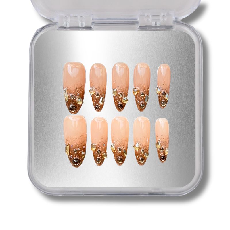 Golden Drip is a luxe nude press-on nail set with bronze glitter tips and 3D golden crystal accents. Perfect for nights out, special events, or anytime you want nails that shimmer and shine effortlessly.