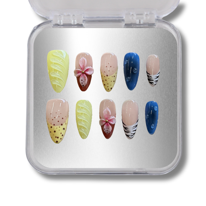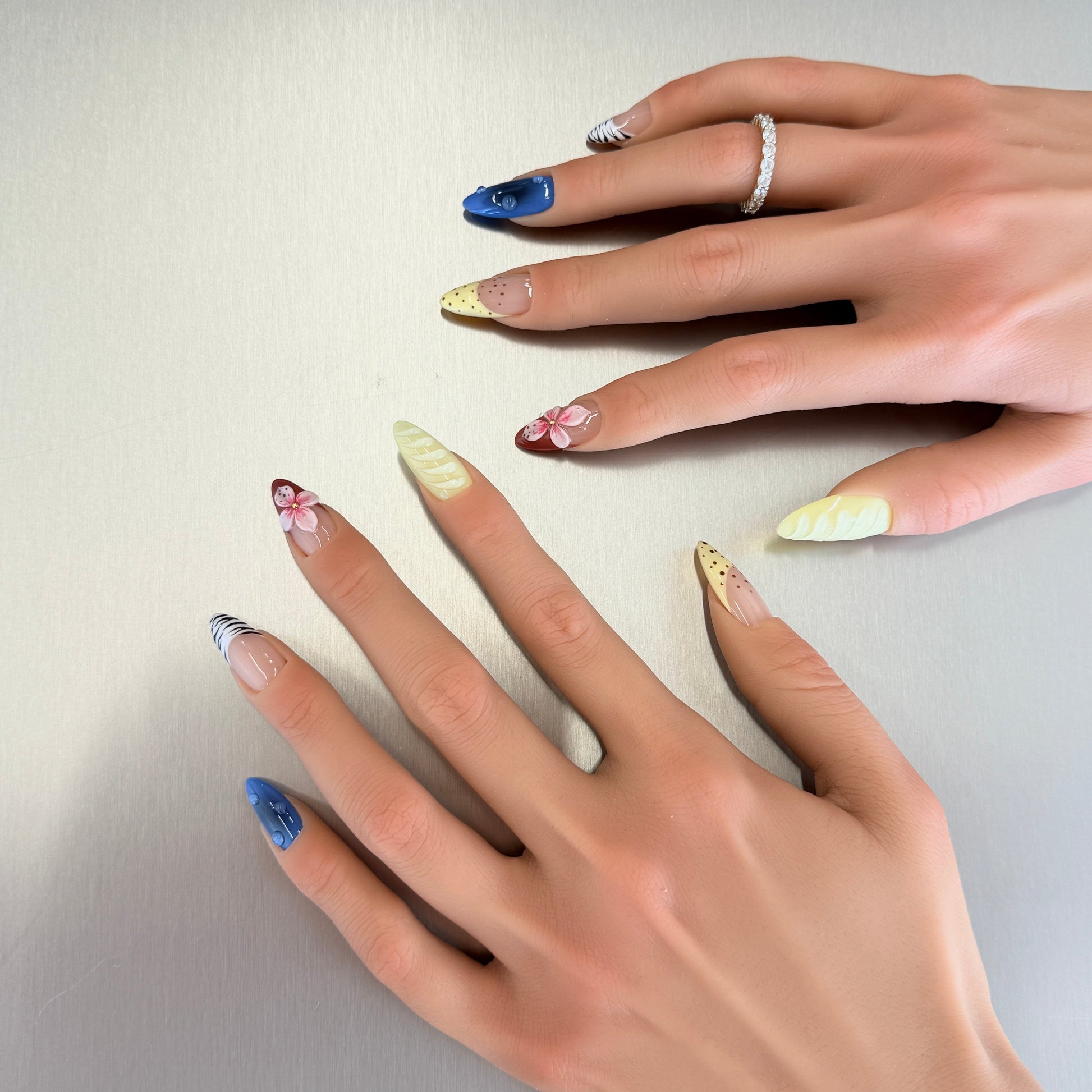 Turn your nails into a vacation mood with Love Island. Featuring juicy yellow tips, tropical florals, ocean blue accents, and bold graphic details, this playful set brings paradise straight to your fingertips. Perfect for summer, beach days, or when you’re craving a getaway.