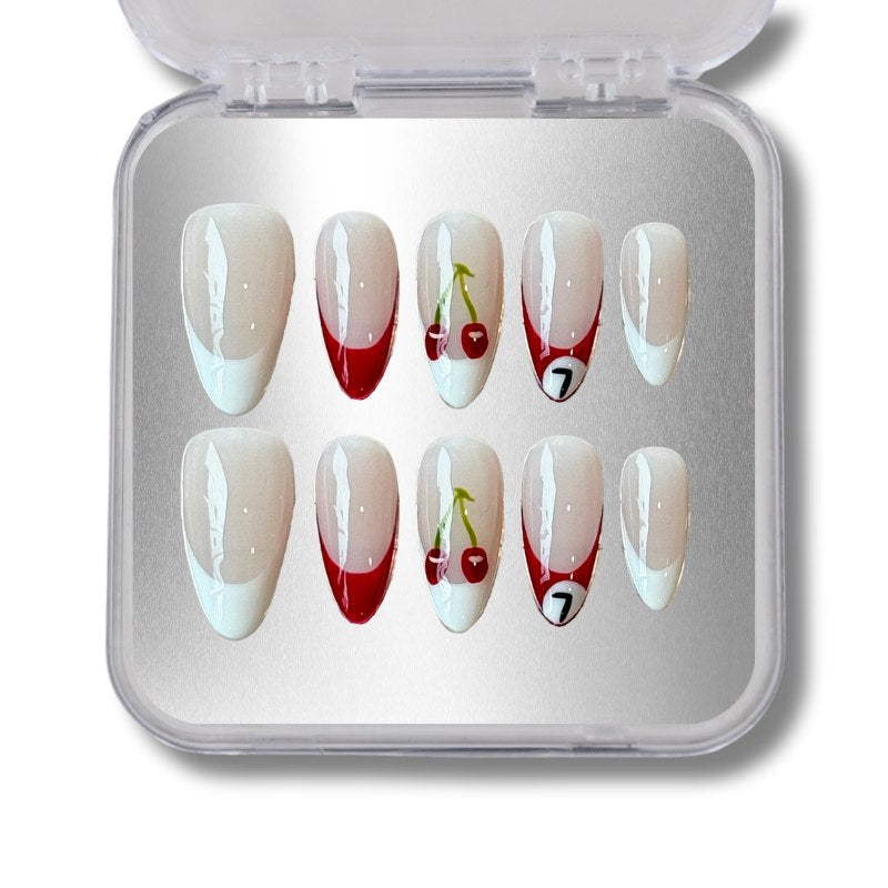 Turn your fingertips into trouble with Lucky Cherry Pop—a glossy nude base with bloody red tips, juicy cherry art, and a sly “lucky 7” accent. Sweet, daring, and just a little dangerous.