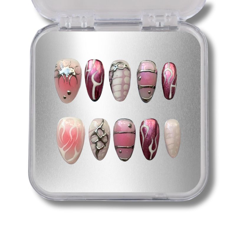 featuring chrome accents, abstract flames, and bold metallic details. Perfect for Y2K, cyberpunk, or statement looks, these long-lasting nails bring salon-level style in minutes. Ideal for parties, festivals, and everyday glam.