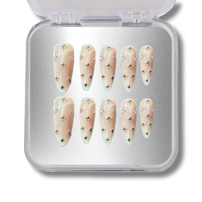 Golden Drip is a luxe nude press-on nail set with bronze glitter tips and 3D golden crystal accents. Perfect for nights out, special events, or anytime you want nails that shimmer and shine effortlessly.