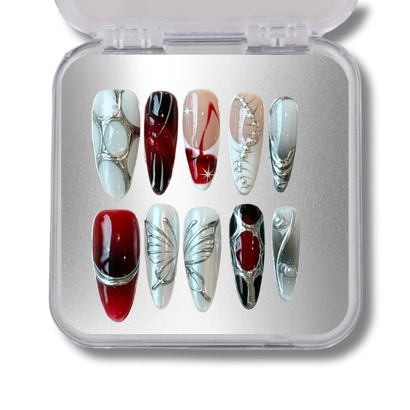 Turn heads with Silver Thorns, a bold press-on nail set that blends luxury and edge. Featuring deep crimson and icy silver nails with 3D metallic accents, butterfly details, and sparkling rhinestones, this set brings salon-quality glam straight to your fingertips.